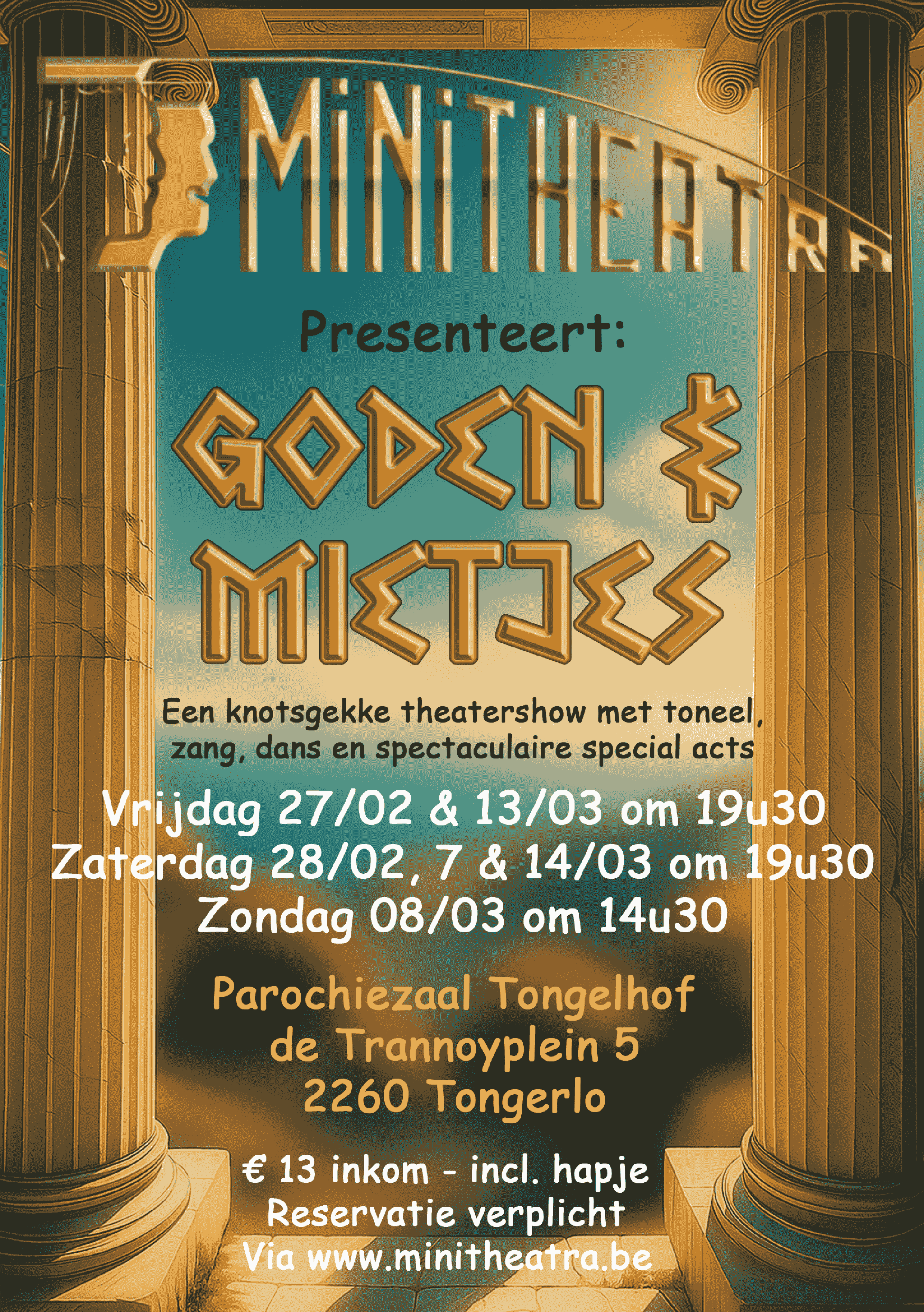 In onze nieuwste productie zijn goden en godinnen neergedaald van hun berg Olympus en maken ze deel uit van onze maatschappij. Hoe vergaat het Zeus, Aphrodite of Medusa op aarde? Verwacht een avond vol herkenbare scènes, vernieuwende acts en komische sketches rond één overkoepelend thema.